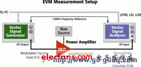 我们使用一台矢量信号发生器(VSG)产生具有所需、幅值和EDGE调制的射频信号。该射频信号通过待测的进行发送,并在矢量信号分析仪(VSA)中进行解调,VSA负责测量并计算EVM。