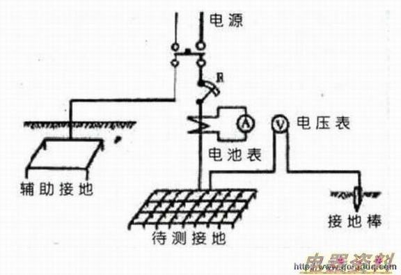 人们对接地的测量是用伏安法(这种试验是非常原始的)。附图中即是用安培计、伏特计的测量方法。在测定时须先估计的大小。再选择适当截面积的绝缘导线。