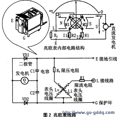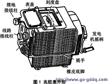 兆欧表俗称摇表、绝缘摇表或麦格表。兆欧表主要用来测量电气设备的绝缘,如:电动机、电器线路的绝缘,判断设备或线路有无漏电现象、绝缘损坏或短路(见图1所示)。