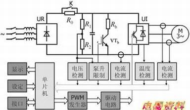 现代脉宽变频器的控制大都是以为核心的数字电路,其功能主要是接受各种设定信息和指令,再根据它们的要求形成驱动工作的PWM信号(见图2)。