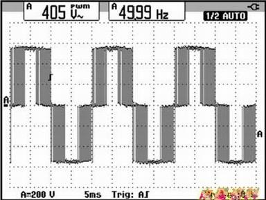 4)调节400V交流至给定频率50Hz,观察PWM 输出电压波形,图5。从该波形可以看出纹波比较小输出比较稳定。