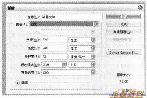 ①首先根据需要需要创建一幅图片,我们习惯使用的软件是photoshop,该软件图形编辑功能强大。以320×240的点阵液晶为例,打开软件photoshop,然后新建一个文件。按下图参数设置完毕后,点击“确定”就可以进行图形编辑了。