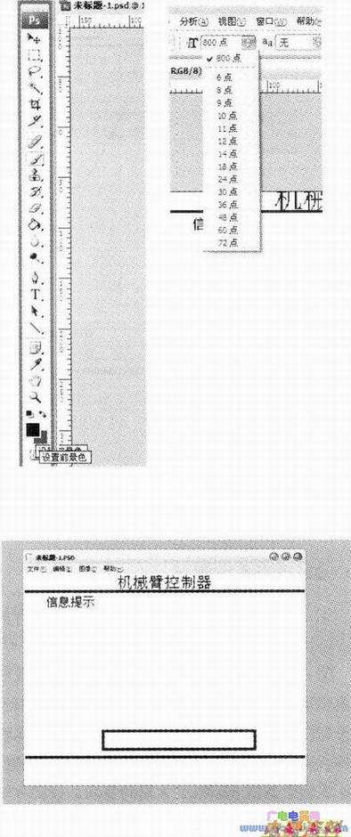 ②利用画线工具和文字工具做的液晶界面,如上图所示。画线时,设置画笔颜色为黑色,按住shiff键就能画出垂直或者水平的线;如果不按住shift,一般不容易画好。另外需要注意的是,如果文字太小可以手动设置字体尺寸,可以超过软件给的最大值72点,如800点。编好的液晶界面如下图所示。