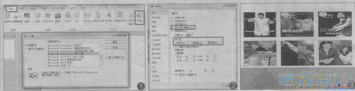 用右键点击它,选择菜单中的“设置对象格式”,在“填充”标签中选择“图片或纹理填充”,接着可以从文件、剪贴板或者剪贴画中选出想要添加的图片。也就完成了第一张“图片”演示文稿的设置(如图2)。