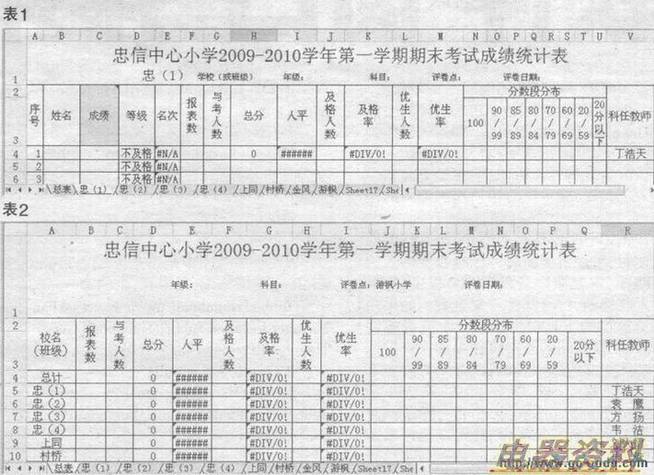 为此,我设计了两张表格。第一张表(表1)中的“忠(1)”到“游枫”的8个工作表分别是对单个班学生考试成绩进行统计(大家可以根据自己的需要设置工作表的数量)。此表既可以作为期末考试成绩统计表,也可以作为日常测试成绩统计表。
