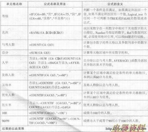 要实现统计自动化,就要给统计表设置统计函数或公式。这是至关重要的一步。单击统计表中的“忠(1)”工作表标签,打开“忠(1)”成绩统计表(如:忠信中心小学2009-2010学年第一学期期末考试成绩统计表),对要统计项目名称的下一行各单元格设置函数或公式见下表。