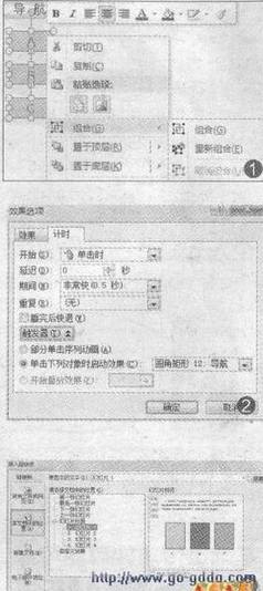 关闭母版视图,然后照常制作幻灯片内容,完成之后,重新进入到母版视图。选定三个较小圆角距形所组合的对象,切换到“动画”选项卡,首先添加一个进入的“擦除”动作,开始为“单击时”,方向为“自顶部”;然后点击“添加动画”,选择退出的“擦除”动作,开始同样为“单击时”,方向为“自底部”。接着选定动画的进入和退出两个动作,点击“效果选项”下面的小箭头图标“显示其他效果选项”,切换到“计时”标签,打开“”,在“单击下列对象启动效果”栏选中“圆角距形导航”(如图2)。
