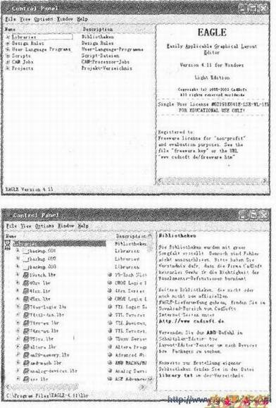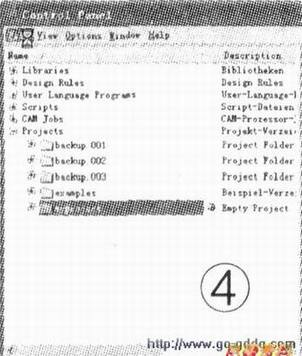 首先启动EAGLE,得到图2界面,然后分析电路构成.555时基集成块;4017十进制计数器;两只;12只;10只。分别属于EAGLE库的liner;40**;caitor;discrecte;.Supplyl。我们在设计电路之前须先打开这些元器件库,以备调用。具体方法:在图2控制面板的library项前单击‘+’,出现图3所示屏面。击打相应库的灰色小球,使之成绿色大球,这些库的元器件就可用了。在图2的控制面板中右击projects,新建一个工程,取名myprjecto如图4所示。下面开始设计原理图,先右击myproject,随即在触发菜单中选择new\schamito将要编辑的原理图命名为fgdl。如图5所示。图5即为原理图编辑界面,在这里就可编辑电路图了:第一步,调入幅框,单击add标签,触发了应用库,寻找frames,并打开,选择一个合适的幅框,就可在其中画原理图了。第二步,调入各元器件,击打ADD标签,在应用库中找到40**,单击‘+’号,找到4017,并单击这时光标处就会吸附一个4017的符号,移动光标,带着符号移动符号到图中合适的地方,单击放下。这时你会发现这个符号只有14个针脚,缺少脚,这时可单击INVOKE标签,击打器件,触发一个选择菜单,如图6所示。然后选择P项,光标处就会吸附一对针脚,把它放在合适的地方。然后再用同样方法放置其元器件。第二步,连结网线与结点。击打NET标签,将各个元器件的针脚连结起来。连结时侯要用“单击起点双击结束”的方法。连结电源针脚可在最先或最后进行,要用到的符号可在SUPPLY1中找到,并用ADD命令添加到合适的地方。