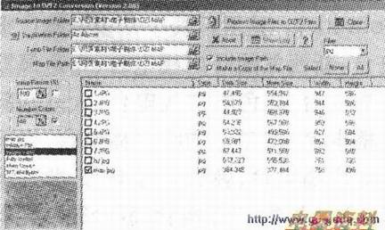 看了界面相信很快就能上手了,最左上角的为扫描后的JPG格式的地图所存在的目录,在这里为“E:\网页素材\电子制作\OZI MAP”,最下面一行目录为转换后的文件的存放位置,在这里与第一行位置相同,即存于同一个目录底下,再向下的白色大块空白区域为文件列表位置,显示第一行目录底下的文件,在界面的右方有一个FIR(过滤器)工具,下拉列表可以选择多种图形格式,用于过滤在下面列表中的文件方便用户查找,上图所示选择了“JPG”格式的FILTER。