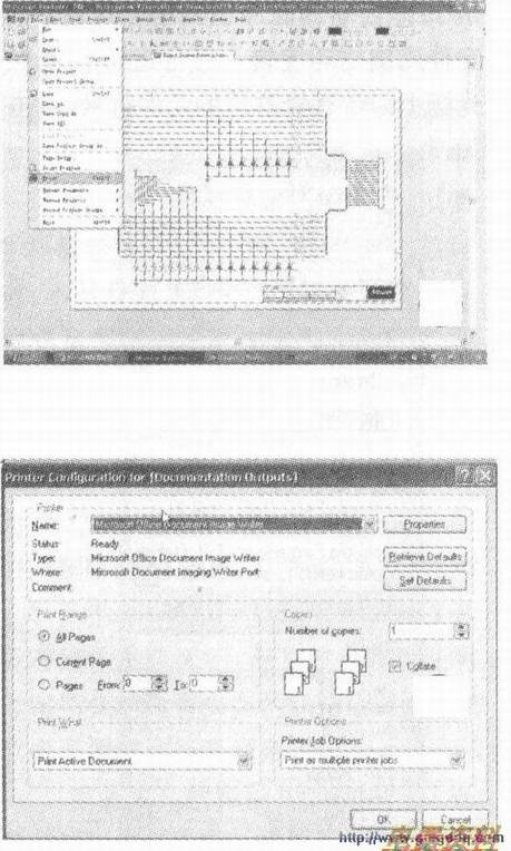 2、在Protel菜单中选择file—print,或点击工具栏上的打印机图标,见上图(安装office 2003后,会在Protel的打印机选项中自动填加Microt Office Document ImageWriter虚拟打印机)。