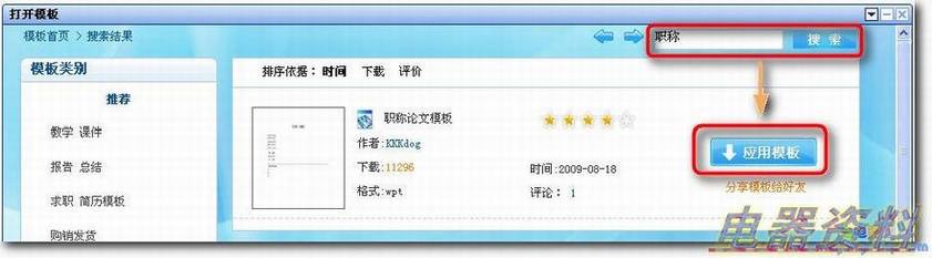 ②查找模板。在搜索框内键入关键词“职称”,回车或点搜索,WPS自动在模板库内搜索。
