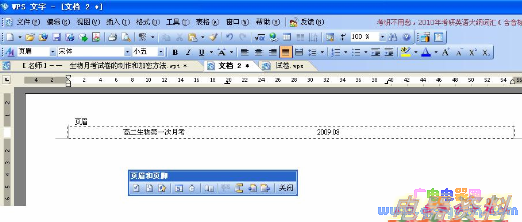 ①单击页眉处,在页眉处输入“高二生物第一次月考及2009.08”字样,并调整好位置使处在正中间。如图4: