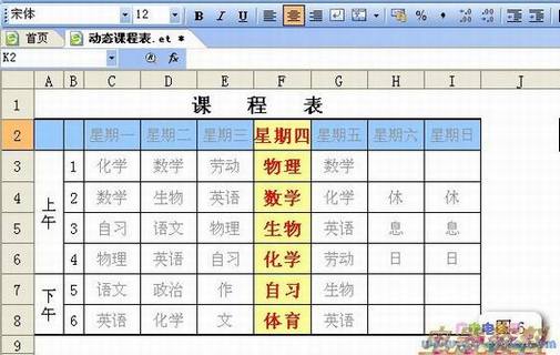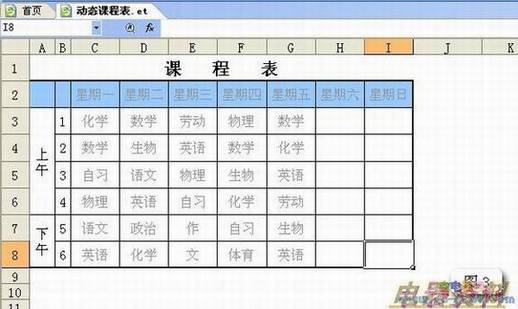 1、制作普通课程表:打开ET,输入课程表(如图1)。