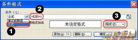5.1、选择C2到C8单元格,选择“格式|条件格式”菜单项,打开“条件格式”对话框。从“条件1(1)”下拉列表框中选择“公式”①,在其右边的框内输入“=$J$2=1”(数字1表示星期一)②,单击“格式”按钮③(如图4)。