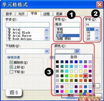 5.2、此时开“单元格格式”对话框,设置文字的“字型”①“字号”②“颜色”③(如图5)。单击“图案”选项卡,设置单元格底纹颜色。