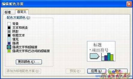 3、用同样的方法修改“强调文字和已访问的超链接”的颜色后,单击“编辑配色方案”对话框底部的“应用”按钮,关闭对话框。
