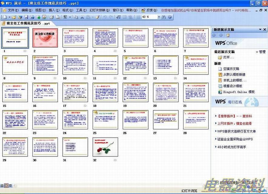 学校将于近期组织一次班主任工作交流,校长要求我准备一份发言稿,在收集资料时想起去年参加市教育局组织的班主任培训班时拷贝的几位主讲教师的课件,忙翻了出来。课件的内容很好,可惜容量很大,每个课件都包含几十张幻灯片(如图1),如果一张张复制、粘贴文字,很容易出现差错。