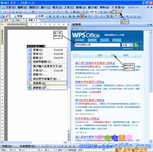 注:不管有没有打开“查资料”窗格,你只要在编辑的文档中选中要查找的文字,右击选择“查资料”,即可自动把选中文字内容复制到“查资料”窗格中,并按选中文字内容完成搜索。