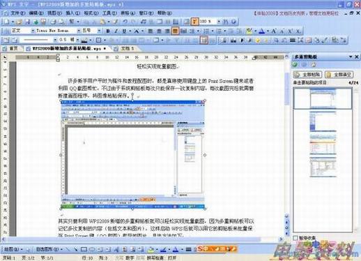 其实只要利用WPS2009新增的多重剪贴板就可以轻松实现批量截图,因为多重剪贴板可以记忆多次复制的内容(包括文本和图片),这样启动WPS后就可以用它的剪贴板来批量保存Print Screen键(QQ截图)截获的图片。具体方法如下: