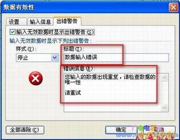 在图一中选择“出错警告”,在“标题”输入框中,输入“数据输入错误”。在“错误信息”输入框中,输入“您输入的数据出现重复,请检查数据的唯一性 请重试”。点击“确定” 如图二: