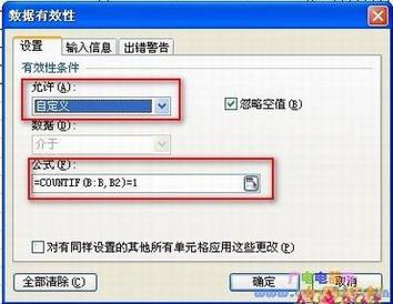 将B列作为验证商品唯一性的唯一值。选择B2单元格,单击数据菜单中的“有效性”,“设置”有效性条件下选择“自定义”,在“公式”输入框中输入公式:“=COUNTIF(B:B,B2)=1” 如图一:
