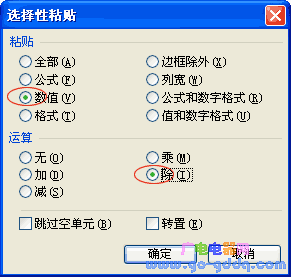 步骤2:选取要转化为万元显示的数字单元格区域(注意:不能包含公式单元格),选择“编辑|选择性粘贴”菜单项,在打开的“选择性粘贴”对话框中选取“粘贴”内容为“数值”,“运算”方式为“除”(加、减、乘同理)。如图 2所示。