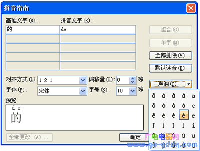 设置了拼音之后,如果需要调整上面的标注,例如图1中的“的”字,标注的时候没有标上音调。选择了“的”之后,再次选择“格式|中文版式|拼音指南”菜单项,打开“拼音指南”对话框,先选择需要更改的韵母,再点击“声调”按钮,选择需要的声调即可。如图2所示: