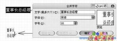 首先在Word中设计好名片的格式、图案,并输入自己的名字,然后单击“合并字符”按钮就会打开“合并字符”对话框,在“文字”处输入头衔名称,并设置好它们的字体、字号并在对话框右侧可以预览到设计的效果,最好单击“确定”按钮即可。