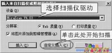 当出现“插入图片”对话框后,我们应在“设备”下拉菜单中选择扫描仪的驱动程序,再确定好图片扫描的目的(打印或者发布至Web页面),点击“自定义插入”按钮(如图2)。