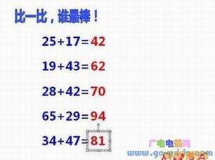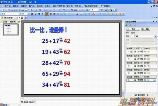 弹出“出现”对话框,单击“触发器”按钮,选中“单击下列对象时启动效果”选项,单击右侧文本框右侧的下拉箭头,在下拉列表中找到与该答案对应的题目“文本框37:25+17=”(如图8)并单击鼠标选中该项,单击“确定”按钮保存设置。这样,我们便将题目“25+17=”设置成了答案“42”出现的触发器。