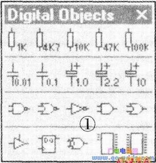 在ProteIDXP和Prote12004两款软件中都具备如图1所示的常用元器件工具栏,在ProteIDXP软件中,进入原理图编辑器后执行菜单命令【View】/【Toolbars】/【DigitalObjectsl,使【DigitalObjects】菜单项前打勾时便可弹出图1所示的面板;在Protel2004软件中,进入原理图编辑器后执行菜单命令【View】/【TooIbars】/【Utilities】,使【Utilities】菜单项前打勾时可弹出如图2所示的面板(一般分布在工具栏上),再点击图2面板上的符号才可弹出图1所示的面板。对ProteIDXP也可采用如下方法调出:进入原理图编辑器,在工作区被激活(在工作区单击一下左键)的情况下,按“B”键,弹出工具栏菜单,再点击“DigitalObjects”选项便有图1显示。