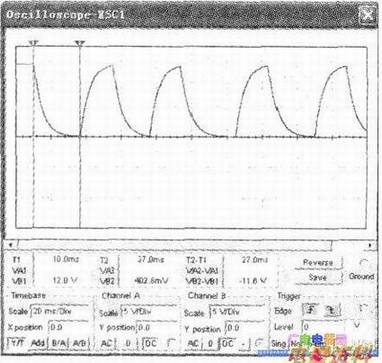在《电工技术基础》课程中,器的充放电过程是比较难以向学生解释清楚的。如果能够借助multiSIM2001在计算机上进行仿真教学,其课堂教学定会起到意想不到的效果。在multiSIM2001中,借助各种虚拟的仪器和建模精确的元器件以及各种便于交互控制的按钮开关器件能够定性、定量而且动态及时地分析出电路的工作过程及运行结果。如上图所示,在multiSIM2001的元件库及仪器仪表库中调用如图所示的元器件及虚拟示波器放置于电路工作窗口上并按图绘制连接好电路,双击打开虚拟示波器显示控制屏并按操作实际示波器的方法合理调节各功能调节按钮。点击电路工作窗口右上角的船形开关(或按功能键F5)运行电路模拟运行其工作过程,并通过敲击分配给单刀双掷开关J1的控制键盘Se(空格键)以使单刀双掷开关适时地接通左边的充电电路和右边的放电电路(由此可见其交互控制功能之强大).这样在示波器显示控制屏上我们可以非常直观清晰地观察电容器按着指数规律充放电的锯齿波波形如下图所示,而且我们还可以非常容易地通过修改充放电回路的大小,以改变电容器的充放电速度以及通过示波器的读数游标方便地测算出该电路的时间常数。