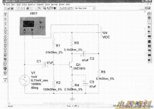 同样在《电子技术基础》课程中的具有稳定静态工作点的放大电路的工作原理也是在课堂上比较难以阐述的一块内容,单凭教师的口授可能是一件事倍功半、费力不讨好的事情,若能结合multiSIM2001进行仿真实验教学定能起到事半功倍的良好效果。按下图所示在已打开的multiSIM2001软件电路工作窗口中调用所需元器件和仪器并排列布置好各元器件和仪器的位置,按图连接好各元器件、信号源及示波器。