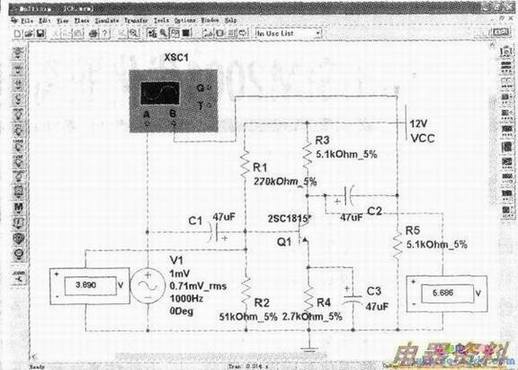 为了使三极管工作在放大状态可以分别在三极管的基极和集电极与公共端之间并连一直流表以测试其静态工作点,通过电压表的显示可以直观观察到下图所示电路静态工作点设置偏高使得晶体三极管进入了饱和区而无法正常工作在放大状态,借助两电压表的监测我们将下图所示电路中的基极上偏R1由原来的51kΩ增大至现在的270kΩ.将基极下偏R2由原来的120kΩ减小至现在的51kΩ,至此我们可以通过直流电压表监测到晶体三极管的集电极电位为5.686V,基极电位为3.890V(如图4所示),从而很好地保证了晶体三极管各电极的电位满足Vc>Vb>Ve,使之工作在放大状态(由此可见其仿真实验操作过程同真实实验过程非常相似)。
