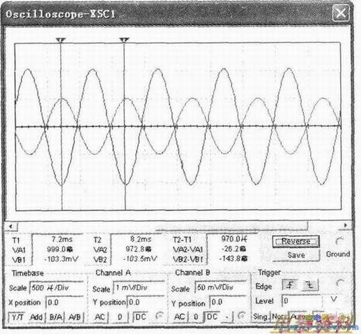 在仿真软件中进行了上述静态调试之后,接下来我们就可以借助虚拟示波器来动态地观测该放大电路的输入、输出波形并测试其电压放大倍数,从而从定性与定量两个方面动态直观形象地展示该晶体三极管放大电路的工作原理。如上图所示在电路的输入端注入一个最大值为1mV、为1000、初为O度的正弦波信号,并将虚拟双踪示波器的A通道接于电路输入端,B通道接于电路的输出端以便对比观测输入/输出波形在各参数上的差异关系。同时为了有利于区分输入、输出信号的波形,软件支持以不同颜色显示不同通道的波形,因此本文中我们将连接电路输入端的A通道导线设置为默认颜色红色,而将连接电路输出端的B通道导线设置为蓝色。鼠标双击示波器以打开示波器显示控制屏。合理设置示波器各功能按钮即可在示波器的显示控制屏上动态地显示出电路的输入/输出波形如下图所示,通过示波器显示控制屏我们可以非常直观地观察到输入、输出信号相位相反而且幅度得到了放大。这就通过仿真实验很好地解释了共发射极放大电路为放大器这一结论。同时我们还可以通过读数游标非常容易地读取在某一时刻输入/输出信号的瞬时值(如T1=7.2ms处,输入信号为999.OuV即约等于1mV.输出信号为-103.3mV。可以移动读数游标并观测示波器显示控制屏左侧第一行的读数栏方便地读到).从而可以非常容易而且精确地从数量上计算出该晶体三极管放大电路的电压放大倍数为AvVVo=-103-3/1≈103.而且我们还可以通过虚拟示波器的读数游标测量得到输入/输出信号的其它诸多参数指标。