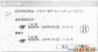 8、选中该“复件MultiSIM.exe”文件,单击菜单“编辑/剪切”,后退到电子仿真软件Multisim7Demo的安装路径C:\ProgramFiles\Multisim7Demo,双击Multisim7Demo文件夹,打开Multisim7Demo文件,再单击菜单“编辑/粘贴”,这时,在打开的Multisim7Demo文件中会增加一个“复件MultiSIM.exe”(注:下一次继续汉化完成后,再执行单击菜单“编辑/粘贴”时,因为上一次已经存在“复件MultiSIM.exe”,会出现如图8所示询问“是否复盖”对话框,单击“是”即可),最后双击该“复件MultiSIM.exe”,即进入电子仿真软件Multisim7Demo的基本界面。