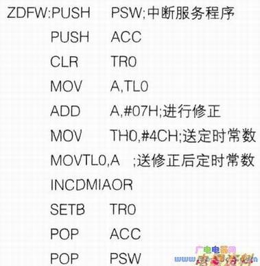 可以看出,每中断一次会比定时值长了5.43μs即5个机器周期,所以我们应考虑由停止计数(CLRTRl)到重新启动计数(SETBTRl)之间的5个机器周期的时间。下面我们来分析一下中断服务程序,CLRTRO指令(定时器停止计时)占1个机器周期,两条MOV指令占了2个机器周期,INC指令占了1个机器周期,SETBTRO(定时器开始计时)占了1个机器周期,在中断服务程序中给定时器赋初值时共占用了5个机器周期,所以,应该在给定时器赋初值时加上这个误差,可以把中断服务程序作如下修改: