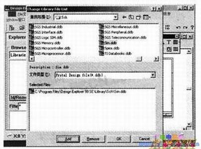 打开或新建好要设计的数据库,新建一个"SchematDocument"文件Scileetl.sch,如上图所示。点击左面窗口下的"Add\Remove"按钮,弹出"更改库文件列表"窗口。在窗口的"查找范围"右侧的下拉菜单中,按上面的路径找到文件夹Sch;然后在"查找范围"下面的大窗口里找到仿真元器件数据库Sim.ddb;按"Add"按钮,如下图所示,再按"OK"按钮就把仿真元器件数据库加载完毕。
