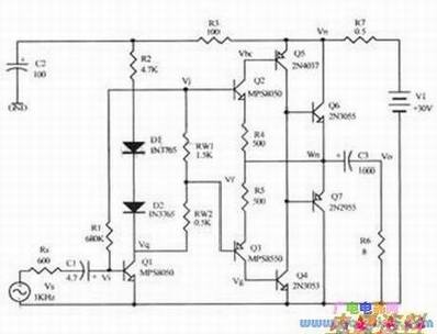 添加好仿真元器件数据库后,在左面"Browse Sch"标签页内的下拉菜单下就会有好多元器件库。中间的窗口是用来显示被选中的库内的具体元器件。这些库是我们在放置不同的元器件时根据要求进行选用的。其中、、、保险丝、信号源、电源等在"Simulation Symbols.lib"库中;双极型在BJT,lib库中;在Diode lib库中;运算放大器是"OpArTlp.lib";等等。放置元器件的操作方法与绘制平常的原理图类似,只是不要忘记加上信号源以及直流源。下图是我们要进行仿真的一种音频功率放大器原理图。