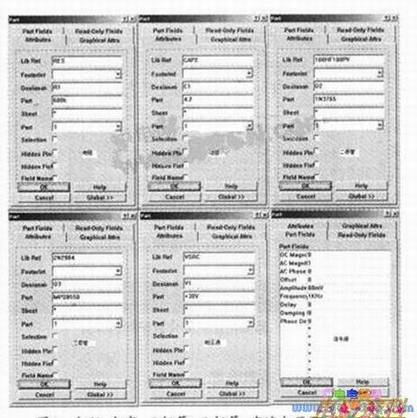 、电容、二极管、三极管、直流电压源、交流正弦信号源的设置示例如下图所示。其中交流正弦信号源的的参数,除了在"Attributes"标签页中的外,还须在"PartFis"标签页中设置。该页中"DCMagnitude"是直流大小;"ACMagnitude"是交流大小;"Phase"是;"Offset"是偏置;"AmplittJde"是峰值大小;""是;"Delay"是延时;"Damgfactor"是阻尼因子;"PhaseDeIay"是相位延时。
