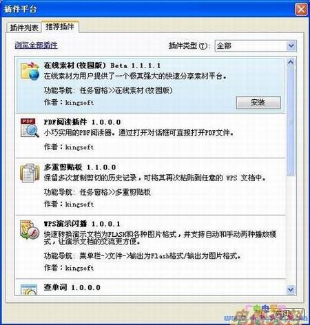 2、单击对话框顶部的“推荐插件”标签,在推荐插件列表中并未找到所需的插件,不要紧,单击对话框上部的“浏览全部插件”(如图3),即可进入WPS官网的插件版块,在这里可以看到官方公布的最新插件。