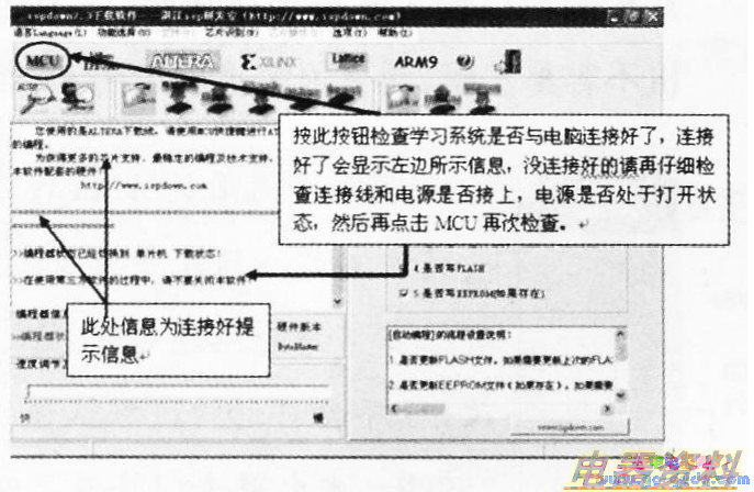 3.点击MCU见下图,查看实验板与电脑是否连接好并处于下载状态。如果没有连接好,请注意检查连线和电源。如果连接正确并打开了学习系统的电源,信息栏中会有正常连接提示;如果没连接好‘文件'、‘芯片识别'、‘芯片操作'菜单将呈灰色显示状态,表示这些菜单此时不可用。