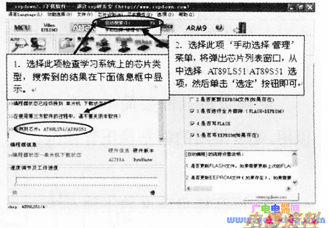 4.接F9或选‘择芯片识别'菜单中的'自动搜索'选项,检查学习系统的芯片型号。在信息栏中会提示检测到相关芯片的型号,如下图所示。你会经常发现在自动识别芯片时,系统提示‘没有检测到可支持的芯片'。这时,需要你进行手动设置,如下图中第二步选择‘手动选择/管理'菜单,从弹出芯片列表窗口中,选择AT89LS5lS5l选项,然后单击‘选定'按钮即可。