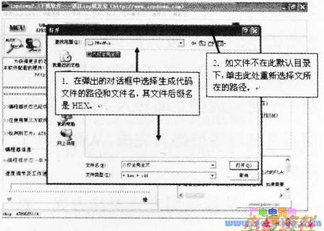 6.选择要装入.HEX文件,如“八灯全亮全灭.HEX”的路径(此处在默认值),选择该文件后,按“打开”按钮,将该文件装载进去。如文件不在默认目录下,就需要重新选择文所在的路径,如下图所示的第二步。