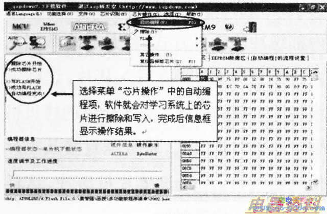 7.学习板上的下载选择开关必须拨向123一面。按F1O或选择‘芯片操作'菜单中的‘自动编程'选项,程序就会从把刚才装载好的“八灯全亮全灭.HEX”文件通过下载端口装入到学习'\统的芯片中,如下图所示,并同时启动程序运行。当然,偶尔会出现下载失败的情况,此时只需要重新按一次F1O键再下载一次就可以了。