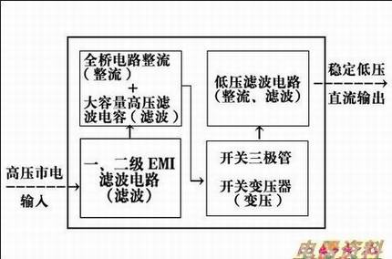 如上图所示,电源内部的大致流程为:高压市频交流输入 → 一、二级滤波电路(滤波) → 全桥电路整流(整流)+大容量高压滤波(滤波) → 高压直流 → 开关三极管 → 高的脉动直流电 → 开关变压器(变压)→ 低压高频交流 → 低压滤波电路(整流、滤波) → 稳定的低压直流输出