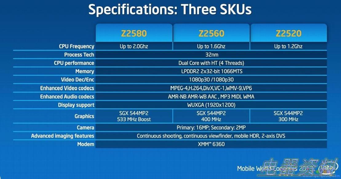 代号为Clover Trail+的凌动家族已经有Z2580、Z2560和Z2520,频率分别为2.0GHz,1.6GHz和1.2GHz,配备了最高达533MHz带boost模式的图形核心,分别面向高性能和主流智能手机市场。