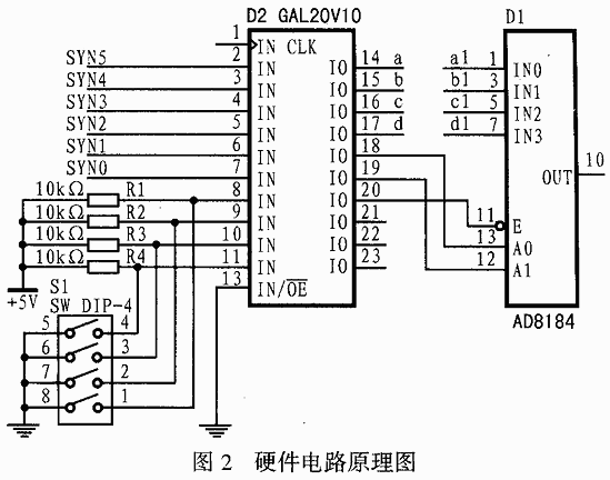 3 设计过程 3.1 确定设计目的 由于每一通道的电路都是相同的,考虑到硬件电路以及电路板容量的问题,可先将64个通道分成16组,即每块电路PCB板设计四个通道,这16组利用SYN2,SYN3,SYN4,SYN5和拨码开关S1选通,然后利用SYN0,SYN1产生选通每块电路板的四个通道的选通信号A0、A1和输出使能EN,其电路原理如图2所示,信号的先后次序及逻辑关系见图3。 3.2 PLD器件的选择和输入输出的确定 由于CUPL语言与器件和生产厂家无关,根据设计目的和要求,最简单、最常用的GAL22V10可以作为目标器件。根据GAL22V10的技术资料和器件各个管脚的定义,可将同步信号SYN0,SYN1,SYN2 ,SYN3,SYN4,SYN5和拨码开关S1的四个管脚作为输入信号,即选择2~11为输入管脚,13脚直接接地,14~20为输出管脚,其中14~17脚用来进行通道选择,18、19脚作为AD8184的选通信号,20脚作为AD8184的输出使能,参见图2。