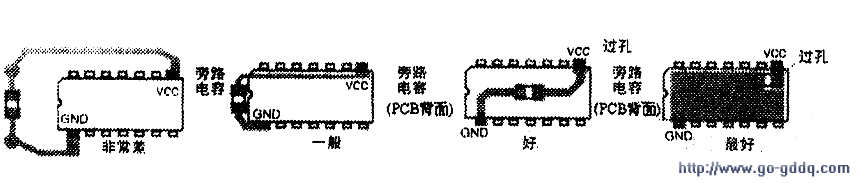 旁路电容的放置也要考虑到它的串联电感值,旁路电容必须是低和低ESL的瓷片电容。但如果一个高品质瓷片电容在PCB上放置的方式不对,它的高频滤波功能也就消火了,图3(c)显示了旁路电容正确和错误的放置方式。