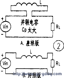 图2显尔了在一个PCB上输入电源通过电感垒负裁的不同走线方式。为了降低电感的Cp,电感的二个引脚应尽量远离。而Vin正极至RL和Vin负极至RL上的走线应尽量靠近。